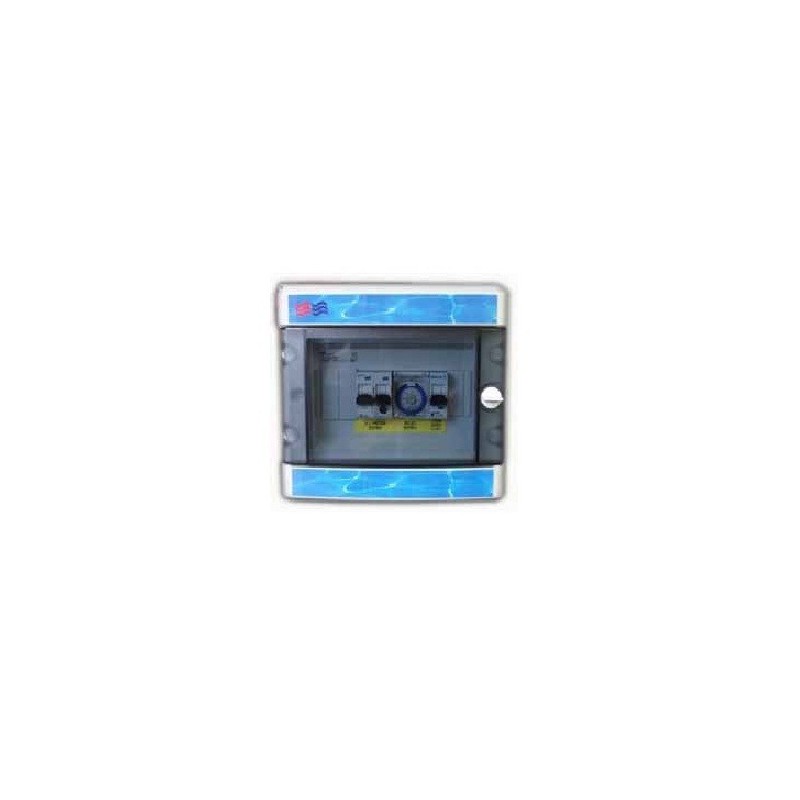 Cuadro de mando y protección para la bomba de filtración en caja estanca IP55, 8 módulos, de 214X234X112 mm, sin diferencial, disyuntor regulable según potencias, reloj programador, interruptor man-aut y contactor.