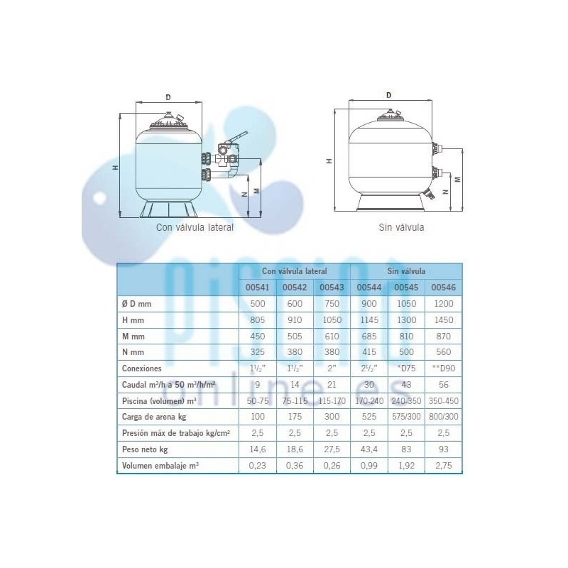 Acabado brillante satinado, con protección antipolvo por medio de un "flash" de barniz transparente de poliuretano. Tapa Ø 400 mm, inyectada. Equipado con purga de aire y agua manuales y manómetro y válvula selectora lateral. Velocidad máx. de filtración 50 m3/h/m2.