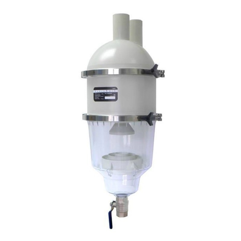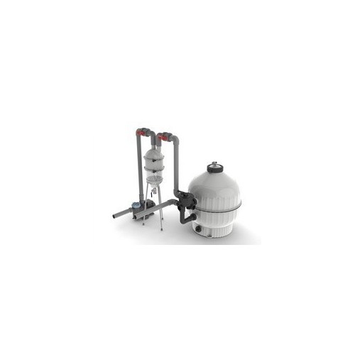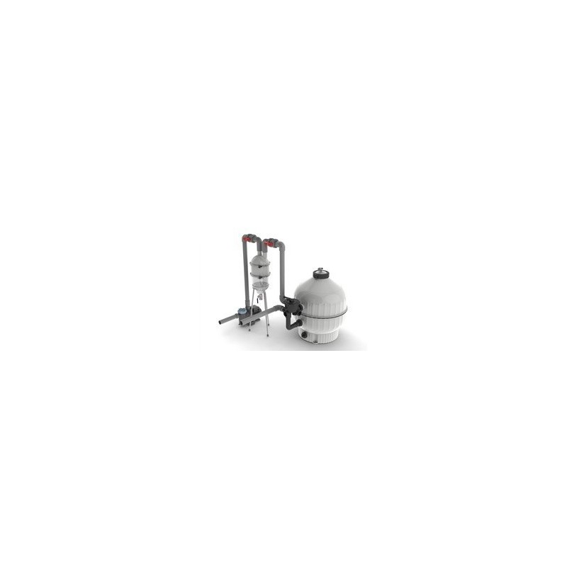 Permite tratar caudales de hasta 30m³/h con una presión máxima de trabajo de 2.5 bar. Se instala entre la bomba y el filtro, separando sólidos de hasta 40 micras de forma que disminuye a la mitad el consumo de agua de lavado del sistema de filtración. El HydroSpin tiene un depósito de recogida de sólidos con 3 zonas diferenciadas (decantación, clarificación y espesamiento). Se puede limpiar con sólo 5 litros de agua sin necesidad de parar la bomba. · Reducción considerable de las operaciones de lavado del filtro. · Pérdidas de carga bajas que permiten instalarlo sin necesidad de cambiar la bomba existente. · Se puede instalar en el suelo con los accesorios suministrados o en la pared mediante bridas DN300. · Conexiones estándar Ø63mm para entrada y salida del agua y Ø32mm para la evacuación de la suciedad. Para instalarlo en la pared se debe adquirir previamente el Kit código 47158.