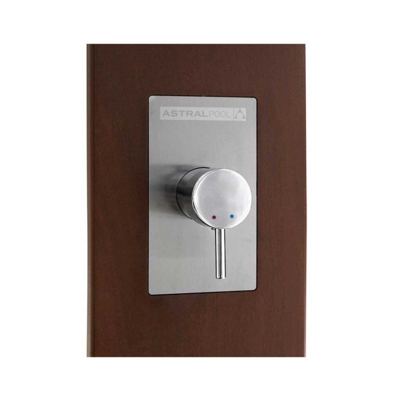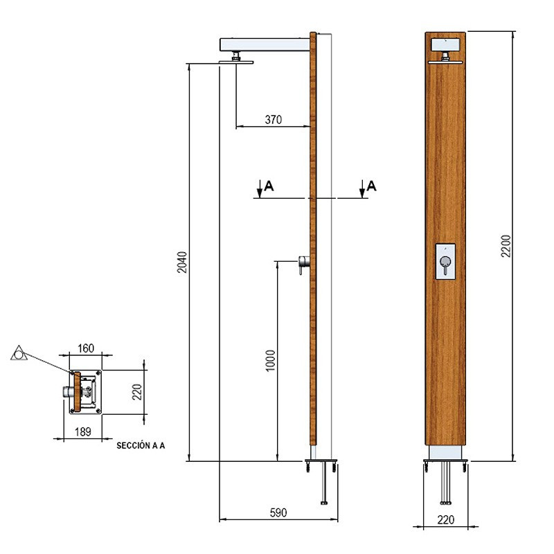 Ducha solar fabricada en madera tropical y acero inoxidable AISI-316 satinado.