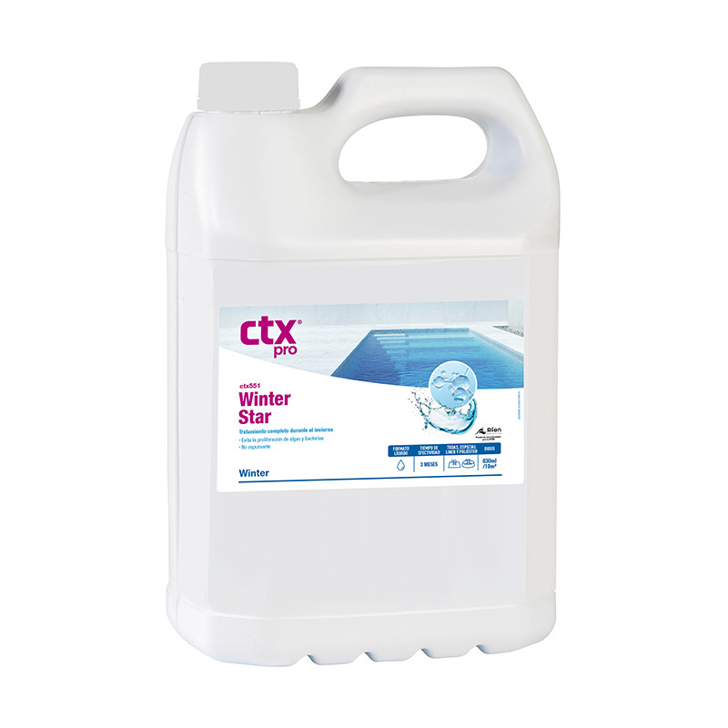 Adicionar al día siguiente 5 lts. de producto CTX-551 por cada 100m3 de agua. El valor pH del agua, deberá estar situado entre 7,2 - 7,6. Verter la dosis necesaria de producto directamente sobre el agua de la piscina, siendo necesario poner el equipo de filtración en marcha, el tiempo suficiente para obtener una buena distribución del producto en el agua. Es aconsejable repetir a mitad de temporada invernal la adición de producto.