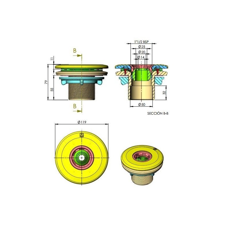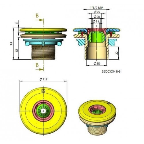 Boquilla de impulsión Multiflow especial para enroscar piscinas liner de la marca AstralPool. Este sistema consiste en que la bola de la boquilla se suministra premarcada con una serie de diámetros que permiten seleccionar uno de los diámetros en su instalación.