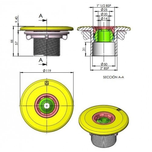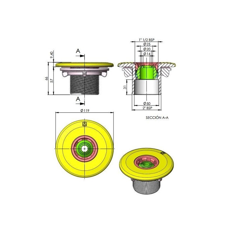 • Rosca exterior de 2", interior 50 mm de diámetro.