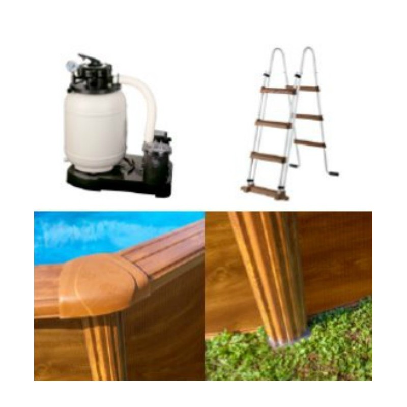 Piscina de 610 x 375 x 120 cm de altura, con liner azul 40/100, perfilería de acero y protectores de inyección. Escalera 2x3 pedaños y filtración