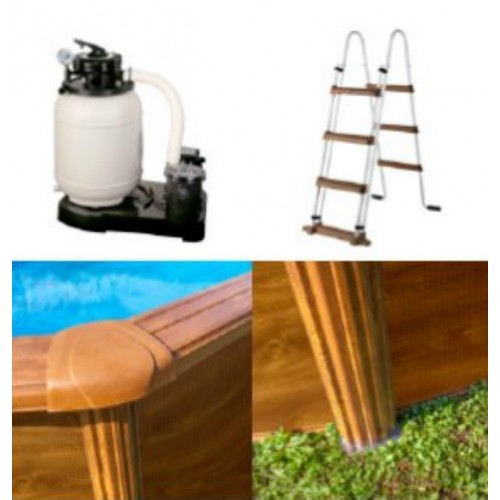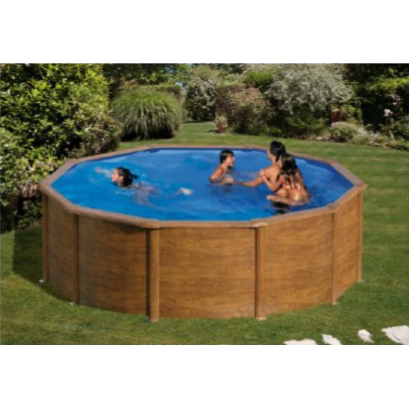 Piscina de Ø 460 x 120 cm de altura, con liner azul 30/100, perfilería de acero y protectores de inyección. Escalera 2x3 pedaños y filtración