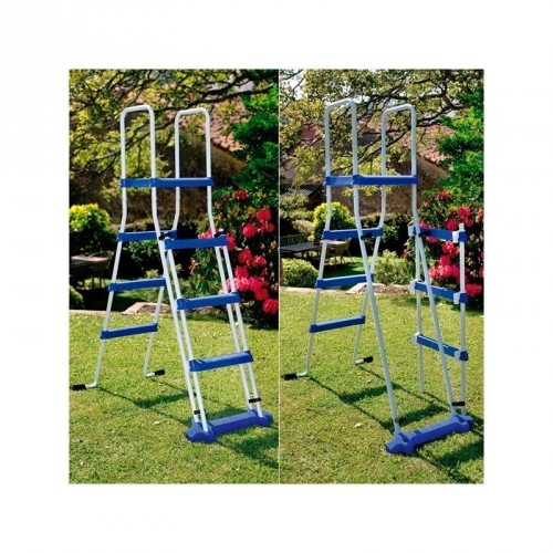 Piscina elevada redonda de pared de acero decoración color blanco D. 460 x 132 cm. Fácil instalación y nulo mantenimiento. Liner Azul 40/100, perfilería de acero, protectores de inyección. Incluye filtro de arena (5 m3/h) y escalera de seguridad plataforma + 2x3 peldaños y tapiz de suelo de poletileno de 115 g/m2.