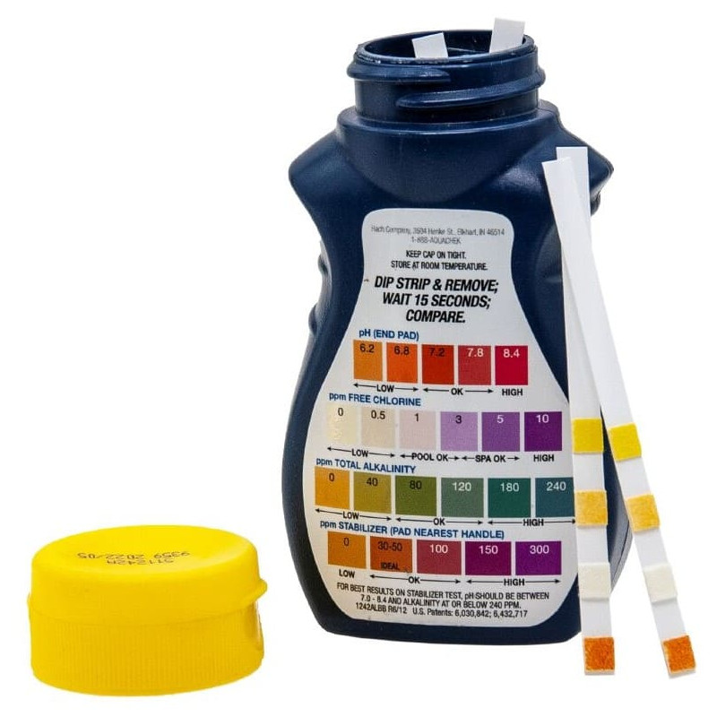 + Las tiras analíticas Aquachek Yellow analizan el cloro libre, el ácido cianúrico, el pH y la alcalinidad total.