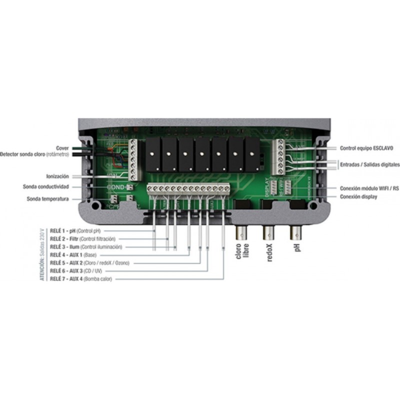 El circuito electrónico de nuestra caja electrónica transforma la corriente (220 V, 50 Hz) en corriente continua de bajo voltaje y alto amperaje. Esta corriente se suministra a unos electrodos de titanio activado con metales nobles colocados en la recirculación de agua en un soporte especialmente diseñado para tal fin.